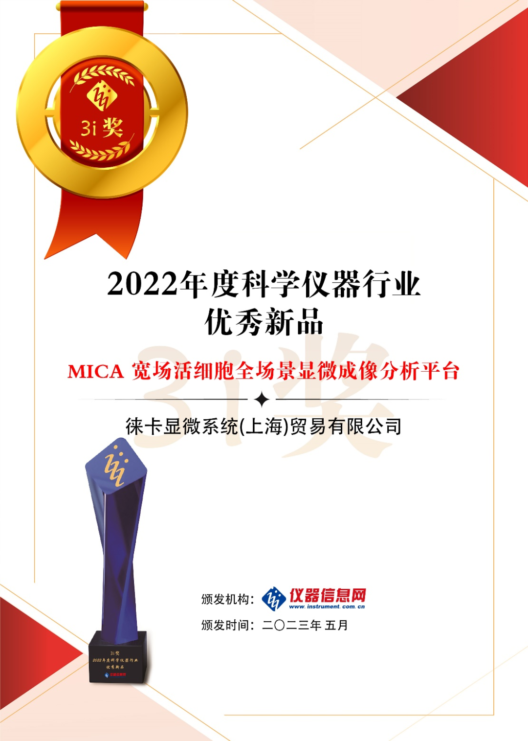 2022年度,共有291家国内外仪器厂商申报了674台仪器新品。经仪器信息网专业编辑团初审后,网络评审团对申报的仪器新品依据创新点、市场前景、用户评价等进行初评,确定226台产品入围。经网络评审团评审,确定51台产品获2022年度科学仪器行业优秀新品“提名奖”。经“技术评审委员会”终审,确定10台仪器获“3i奖-2022年度科学仪器行业优秀新品”。而MICA凭借其独特的整机创新、极简工作流、自动化等特点获得了此项殊荣。