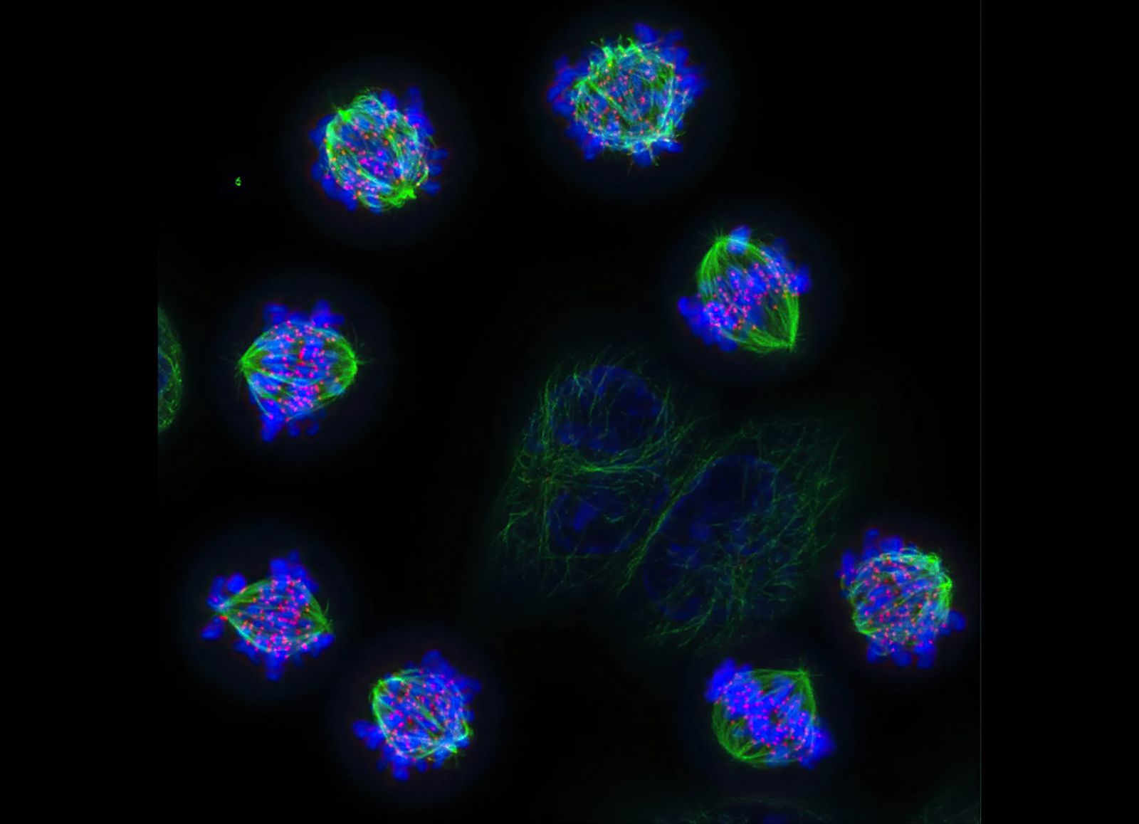 "细胞分裂时,微管通过着丝点附着在染色体上,形成一个美丽的结构--有丝分裂纺锤体。然后,微管将单个染色体拉入子细胞,确保每个新细胞都有一个染色体拷贝。在癌症中,这个过程经常会出现问题,导致染色体不稳定,细胞受损越来越严重。