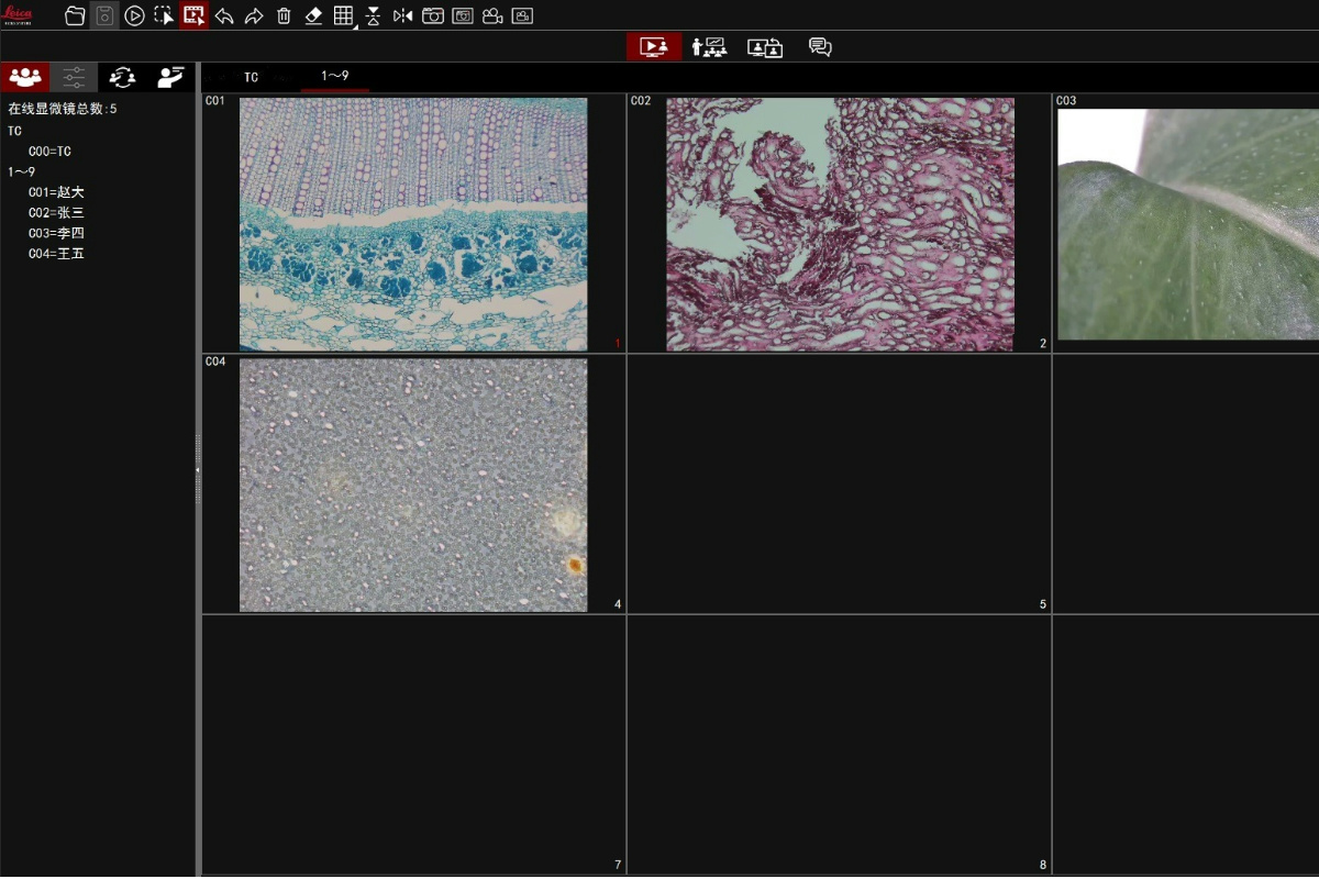 - 教师端界面(TC)默认按学生相机顺序编号,一次可查看9个学生端画面,支持分页标签切换浏览。教师可通过双击单个学生端画面进入单屏显示模式,再次双击即可返回9屏共览。