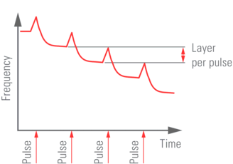 然而,这种测量碳膜厚度方法也有一些弊端。碳蒸发产生的热量和光线会影响晶振片振荡的频率。过一段时间,等数值稳定后,才能得出合理的膜厚测量结果。图1和图2展示了蒸发过程随着时间推移影响晶振片的过程。Flash蒸发以全功率燃烧整段碳绳。脉冲蒸发是通过一个短的特定电压发生的,以沉积少量的碳材料。Flash蒸发可以得到更厚的膜层,但其结果只受碳绳影响。在Flash蒸发过程中,样品产生大量热量。使用脉冲蒸发时,膜厚受每个脉冲的功率、脉冲时间和脉冲数量影响。相比Flash蒸发,脉冲蒸发产生的热量更少。