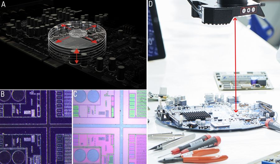 返工检查时遇到另外一项导致效率低下的挑战是无法快速改变显微镜的设置,以让用户从大样品观察切换为细节观察模式。在使用无法提供足够景深、视野和分辨率的体视显微镜时会遇到此挑战,因此需要繁琐的调节工作。