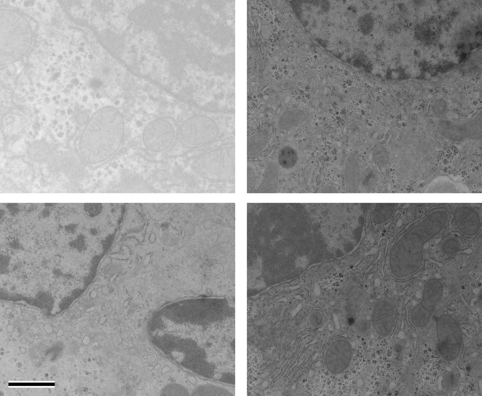 使用 Leica EM AC20 染色时,Pt Blue的步骤延长至 30 分钟,条件与 UA 相同。然后用蒸馏水冲洗载网,用柠檬酸铅染色,并按表 2 所述方法清洗。由图 1 和图 2 可知,经两种染色方法处理后,所有细胞器都显示出良好的衬度,Pt Blue与 UA 染色的超薄切片图片质量相当。两种染色方法不同之处在于,Pt Blue染色的线粒体基质和糖原颗粒衬度更高。与 UA 相比,核糖体的染色衬度更弱。